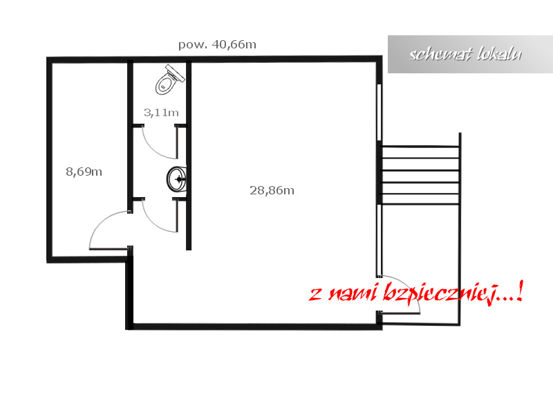 - pomieszczenia głównego o pow. ok. 28,8m2